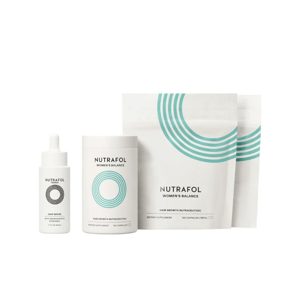 A complete regimen for visibly thicker hair volume and fuller scalp coverage through and beyond menopause. Targets root causes of thinning with a 3-month supply of Nutrafol Women’s Balance Hair Growth Nutraceuticals (1 bottle & 2 refill pouches) and 1 bottle of Hair Serum for Women.